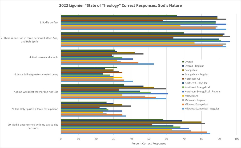 Overall, the American Church’s understanding of God’s Nature is lacking. Positive results on the perfection and nearness of God are overshadowed by denial of the immutability and omniscience of God, the personhood of the Holy Spirit and the divinity of Christ, reducing the affirmation of the Trinity to mere parroting without understanding. The majority of the American Church does not know who God is, which means the majority of the American Church is actually practicing idolatry by worshipping a false god distinct from the One True God of Scripture.
